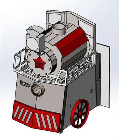 Комплектация: печь «Паровоз 9‑14», чугунная дверца со стеклом, выносной топливный канал, выдвижной зольник, паровозный свисток, «паровозная фара», заливная горловина с обратным клапаном.