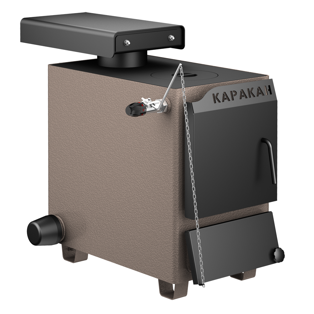Твердотопливный котел Каракан-8 ТПЭ 3 имеет длинную топку (48,5 см), позволяющую топить как углем, так и дровами. Еще одна изюминка котла - вертикальный дымоход, вмонтированный в варочную панель. Для увеличения высоты котла используется специальная подставка. Её корпус выполнен в едином дизайне и снабжен выкатным ящиком. Подсоединение котла к кирпичной дымовой трубе производится через стальной переходник дымохода 7-11 КВ-ПГ. Этот переходник позволяет вывести дымоход не только назад, но и вбок.